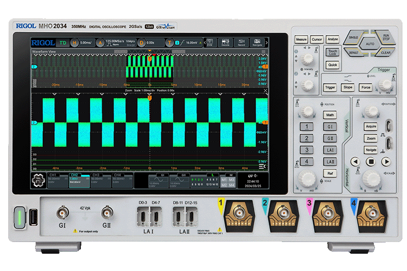 With its 12-bit ADC, the RIGOL MHO2000 Series oscilloscope can capture subtle changes in the waveform, making it suitable for precise requirements such as power supply ripple and medical instrument testing. Meanwhile, its 2 GSa/s real-time sampling rate and 500 Mpts deep memory achieve a 5x oversampling rate, effectively avoiding waveform distortion and making the measured waveforms more real and reliable. In addition, the MHO2000 Series integrates the functions of a digital oscilloscope, spectrum analyzer, signal generator, protocol analyzer, and logic analyzer, meeting various testing needs, reducing desktop space occupation, and being widely used in various complex testing scenarios.