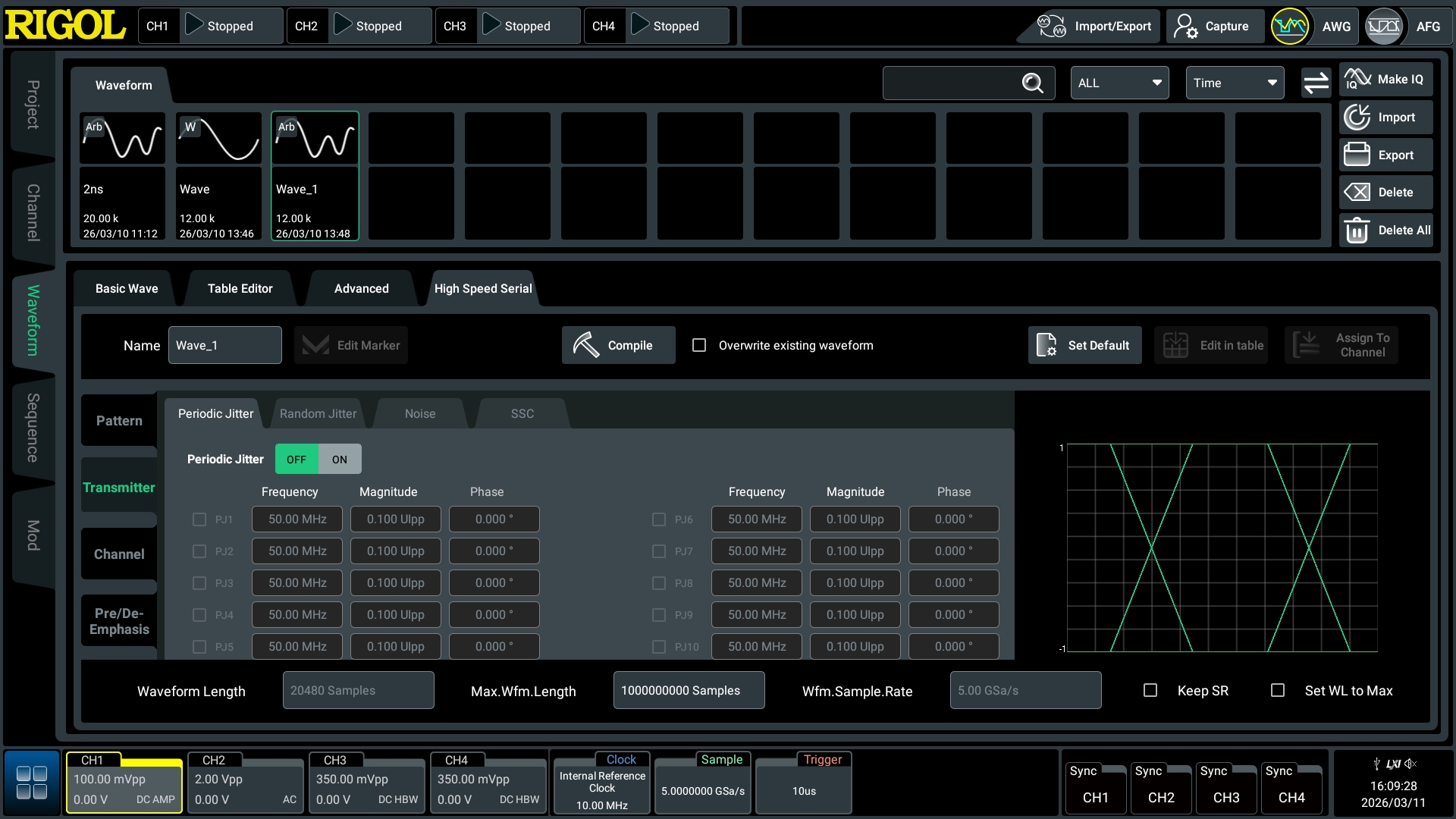 周期性抖动(PJ) : 频率可设定特定的干扰频率, 幅度以峰峰值设定, 模拟由电源纹波、时钟串扰等确定性干扰源引起的周期性时序偏移。