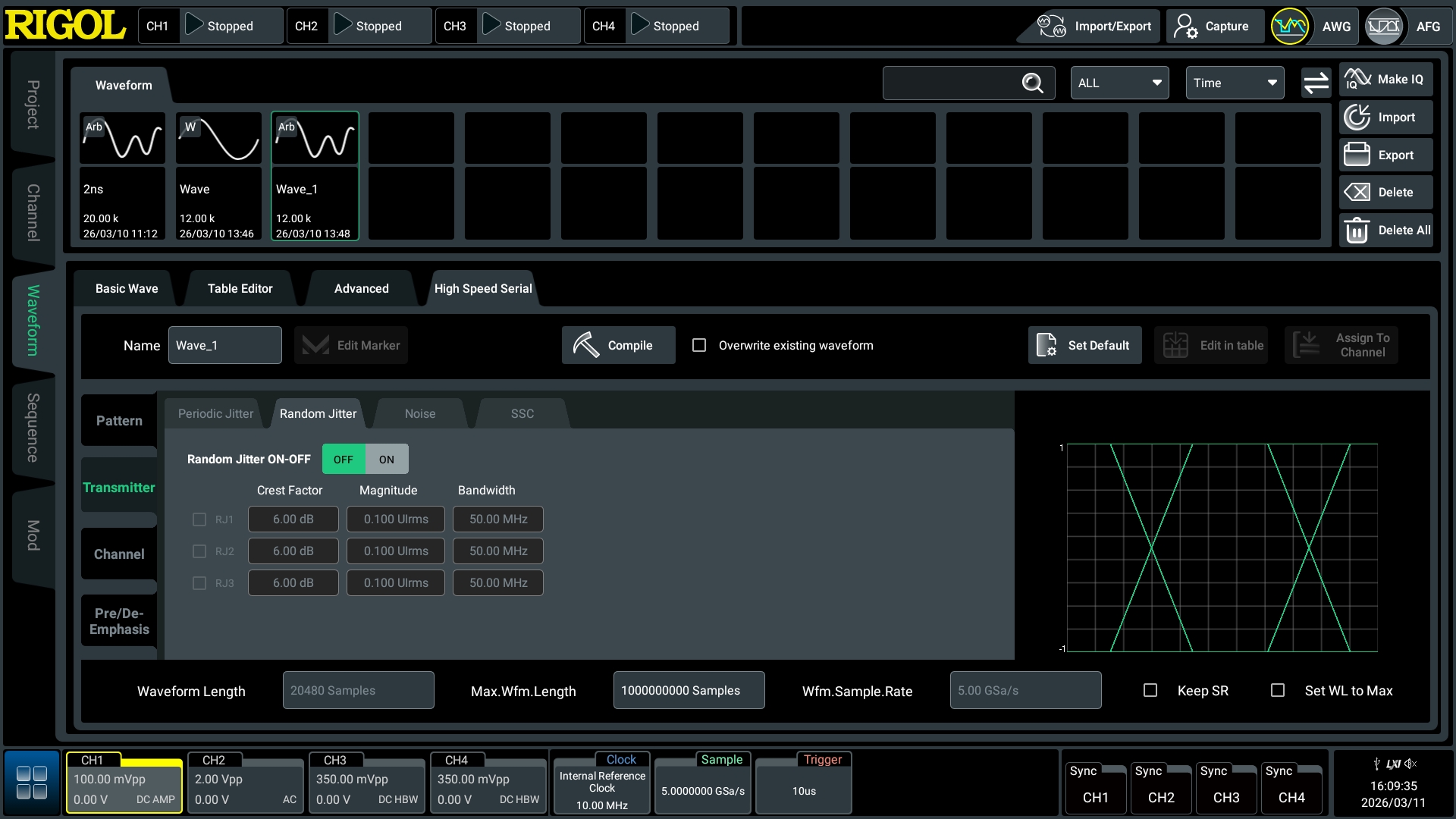 随机抖动(RJ) : 幅度以 RMS 值设定, 可设置抖动噪声的带宽范围, 模拟由热噪声、散粒噪声等宽带噪声源引起的时序变化。