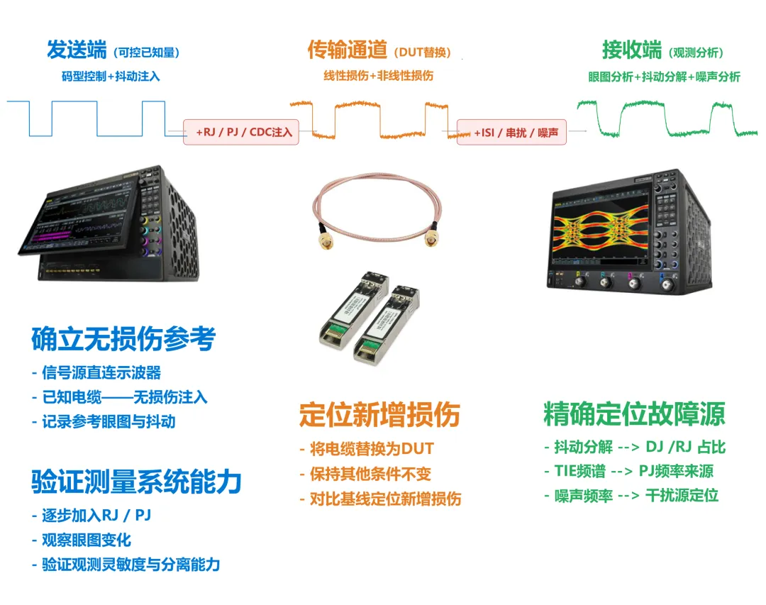 通过组合不同幅度的 RJ 和 PJ,工程师可以构建预定义的“受损信号”,用于: