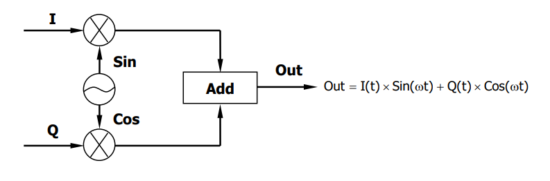 如下图所示,I 和 Q 两路信号分别与 Sin 和 Cos 两个信号相乘后再相加,输出的就是 IQ 已调信号。