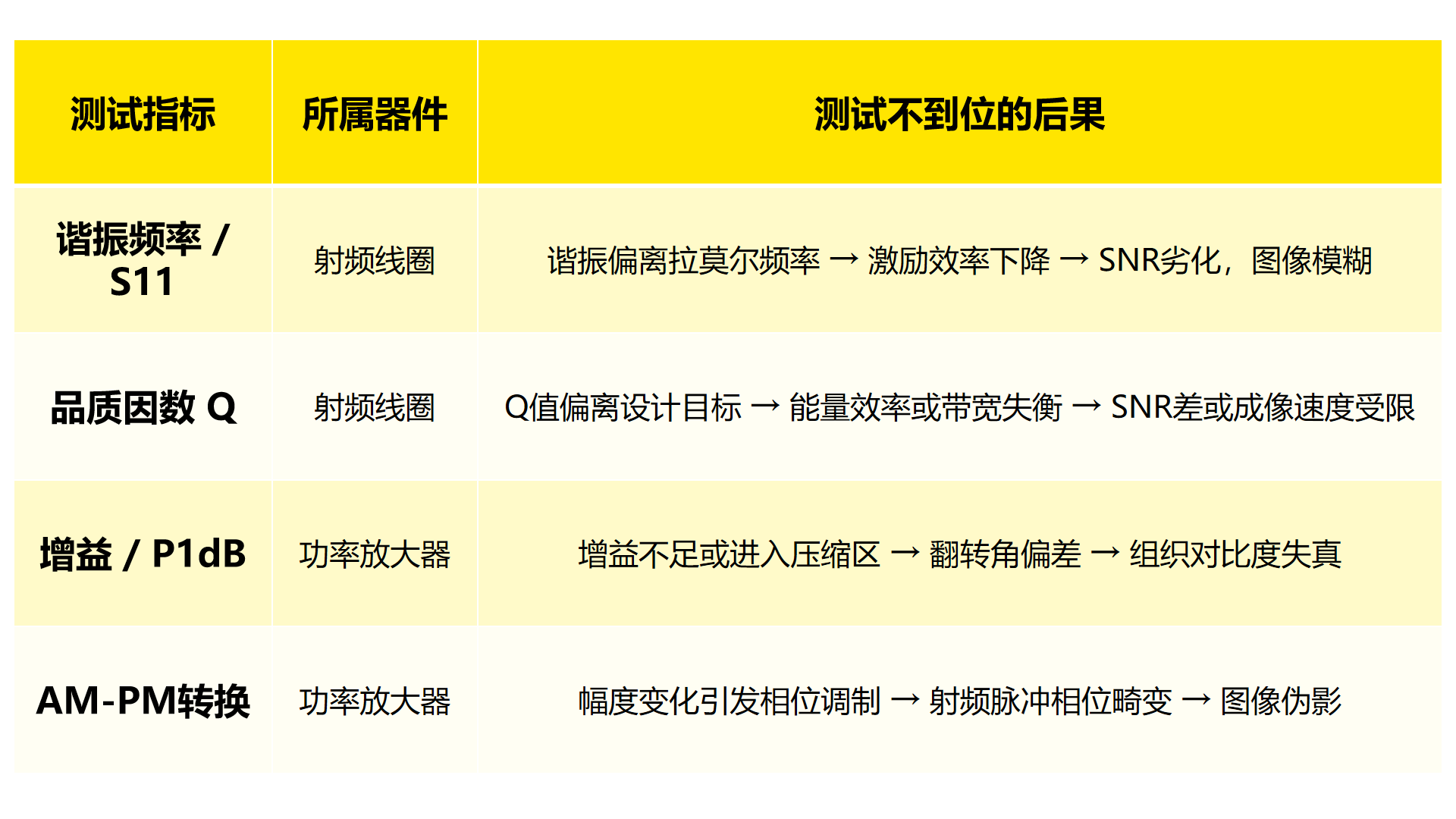 MRI的成像质量本质上依赖于射频信号的完整性。射频脉冲的激发精度、回波信号的接收质量,以及功率放大过程中的失真控制,都会对最终成像效果产生直接影响。这些关键性能指标,需要通过对射频子系统的系统化测试进行量化评估与优化。