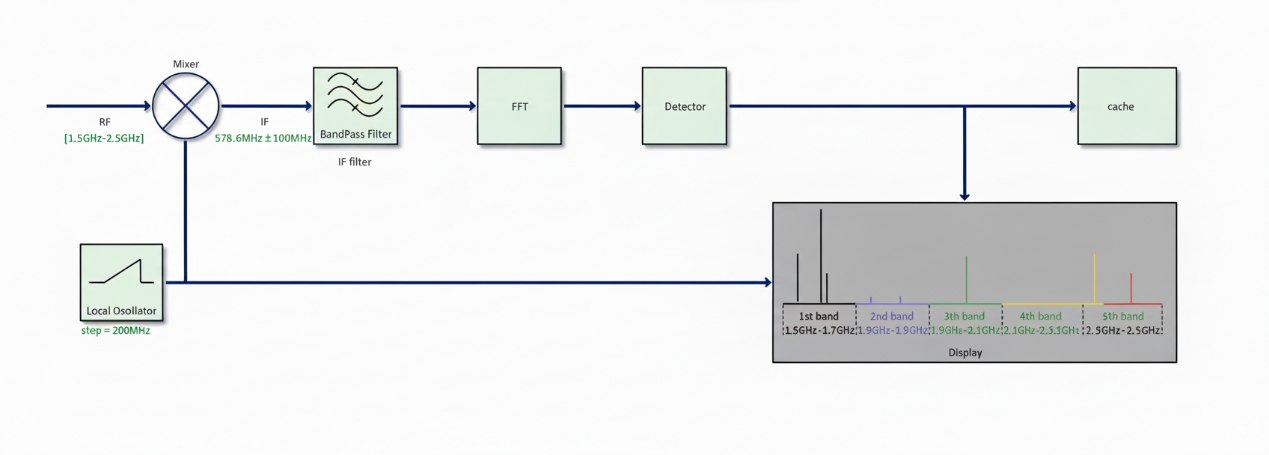 - 第一步 (Step 1):仪器将本振(LO)快速调谐,使接收机的中心频率对准第一个200MHz频谱段的中心。